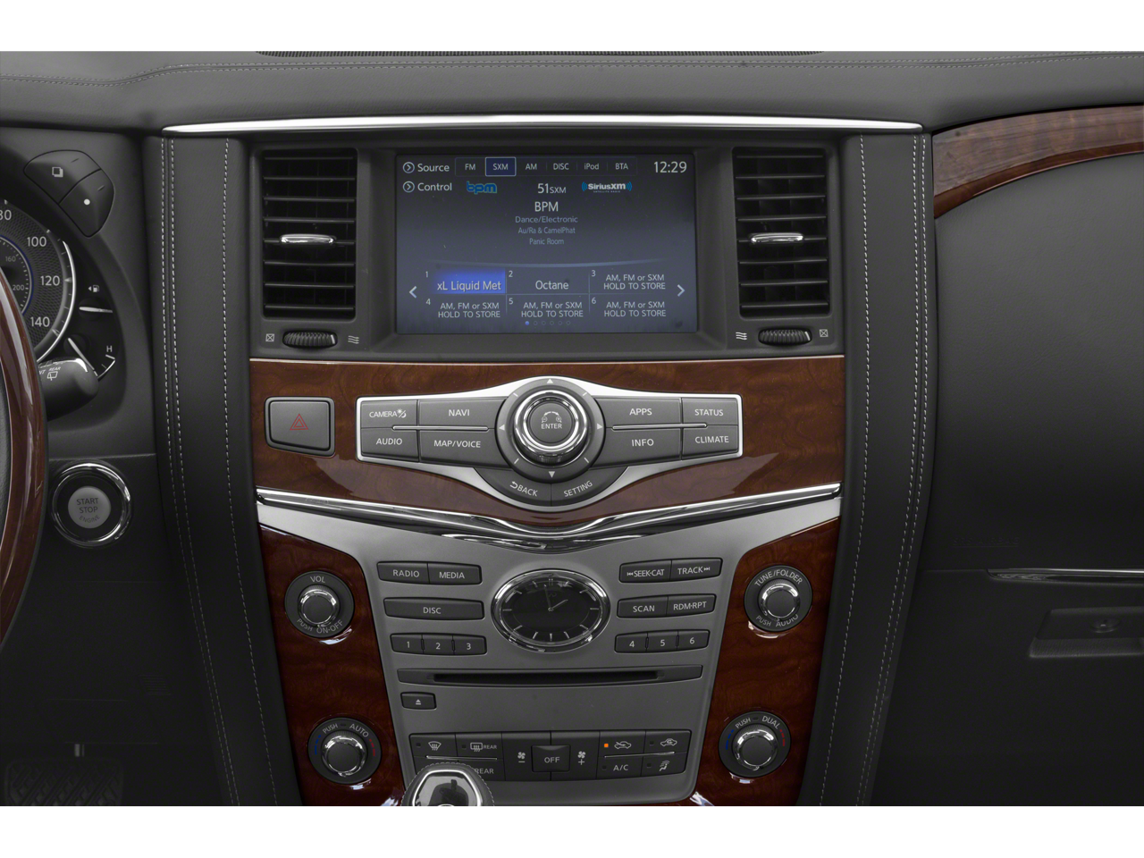 - Radio: AM/FM/HD w/Single In-Dash CD/DVD Player & MP3 -inc: INFINITI controller w/8-inch touch-screen display, INFINITI InTouch navigation w/voice recognition, lane guidance and 3D building graphics, INFINITI InTouch services includes 12-months of safety, security and convenience services, Bose 13-speaker premium sound system including 2 subwoofers, streaming audio via Bluetooth® wireless technology, Bluetooth® hands-free phone system, hands-free text messaging assistant, Radio Data System (RDS), speed-sensitive volume control, driver's audio stage, SiriusXM radio w/90-day complimentary trial, SiriusXM Traffic w/4-year complimentary trial access to real-time traffic information, SiriusXM Travel Link w/4-year complimentary trial access to weather, fuel prices, stocks, sports and movie times and 2 first row USB connection ports for iPod interface and other compatible devices